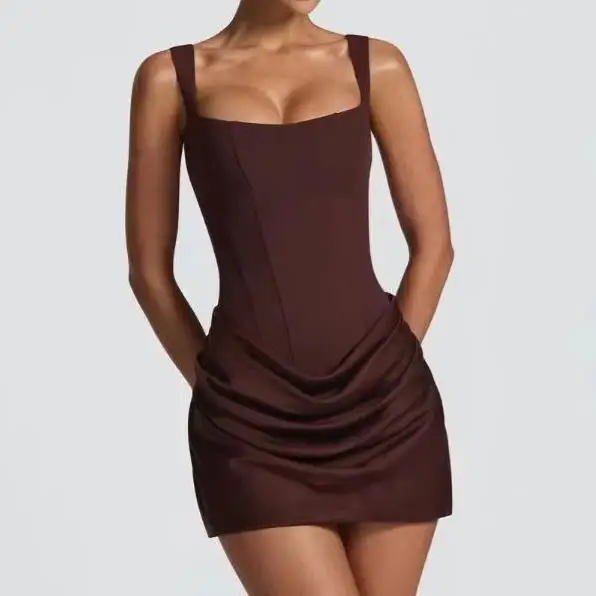 Custom Women's Chic Square Collar Adjustable Straps Backless Summer Dresses Sexy Hip Wrap Pleated Party Evening Mini Dress